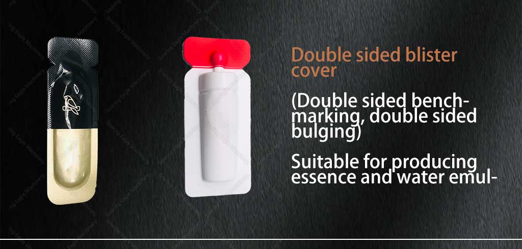 Blister packing machine is suitable for packaging cream, cosmetics, food, chemical products, such as single-dose liquid syrup,olive oil, ketchup, jam, butter, chocolate sauce, honey, perfume, lotion,essential oil, etc.